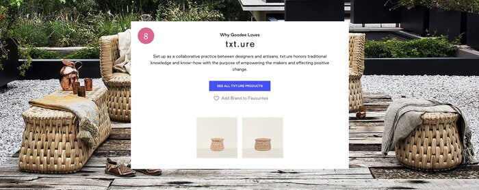 - Los fundadores de GOODEE creen en la fuerza de las historias, que se entretejen en su sitio en múltiples lugares. En cada página de producto, el fabricante del mismo aparece en una sección específica con una breve descripción y un enlace para ver otros productos. Esto también puede ayudar a la venta cruzada (presentando piezas dentro de la misma colección, por ejemplo).
