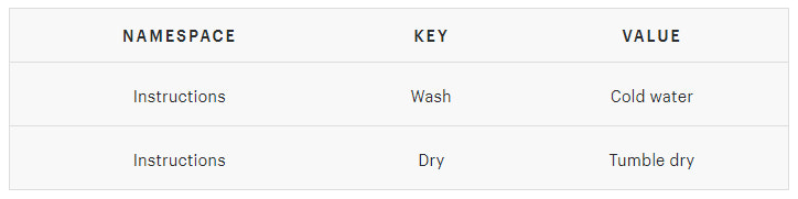 En su forma más senciilla, los metacampos pueden utilizarse para añadir información sobre el producto (como las instrucciones de guidado de la ropa):