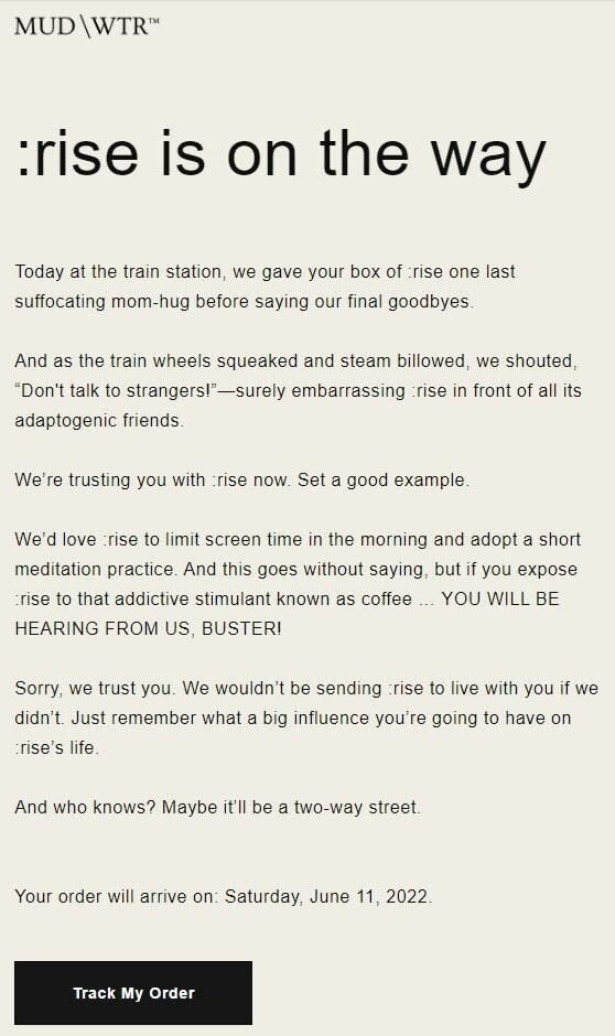 说到令人难忘,MUD\WTR也充分利用了购买后的旅程,包括购买确认电子邮件、发货电子邮件等。