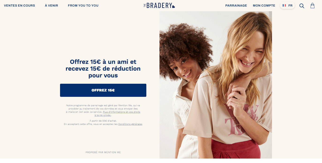 The Bradery, site de ventes éphémères de fins de série de marques tendances, a choisi d’opter pour cette technique de fidélisation. Ainsi, en parrainant un ou une amie, le client bénéficie d’un bon d’achat de 15€ pour chaque personne parrainée et offre par la même occasion à la personne en question, 15€ de réduction à utiliser pour son premier achat. En bref, tout le monde y gagne. Quant à The Bradery, la marque fidélise et recrute par la même occasion. Pour communiquer sur son programme de fidélité, The Bradery y a dédié un onglet en bas de page.