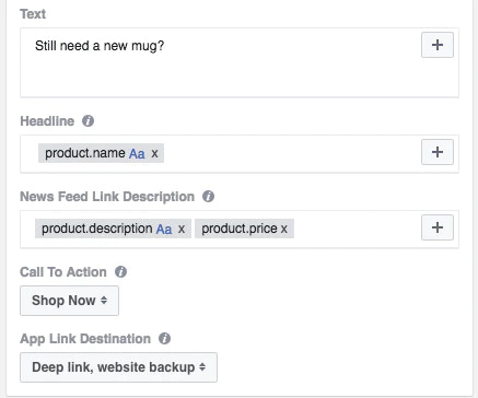 在这些关键字的帮助下,Facebook将能够在广告投放时自动将相关产品信息填充到你的广告中。