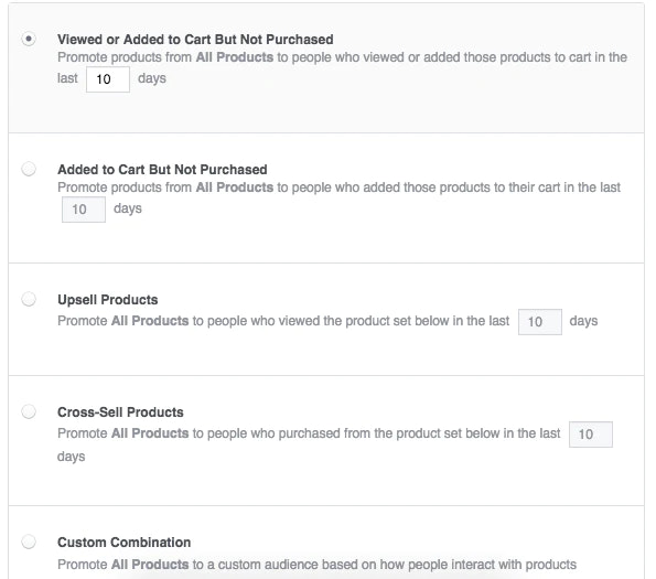 在这里,您将能够选择是否希望击中目标受众的人,谁以前看过你的网站上的内容,添加产品到他们的购物车,或成功购买的产品。这些定制的观众幸好Meta像素已经为你创建了,这是一个巨大的解脱,因为手动设置它们非常耗时(而且令人头疼)。