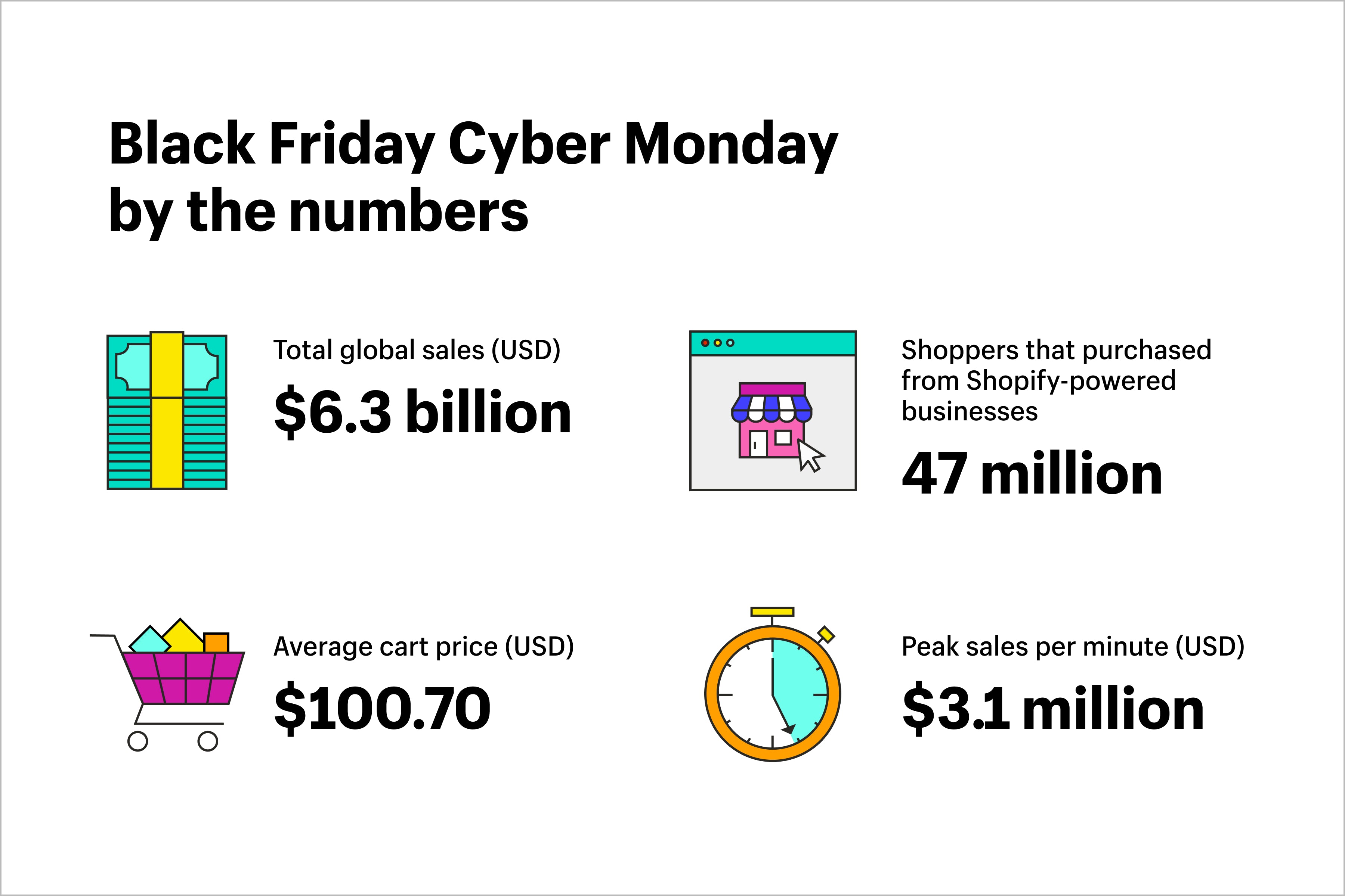 在黑色星期五和网络星期一之间,Shopify店主在全球范围内的销售额总计达到了63亿美元,比2020年增长了23%。
