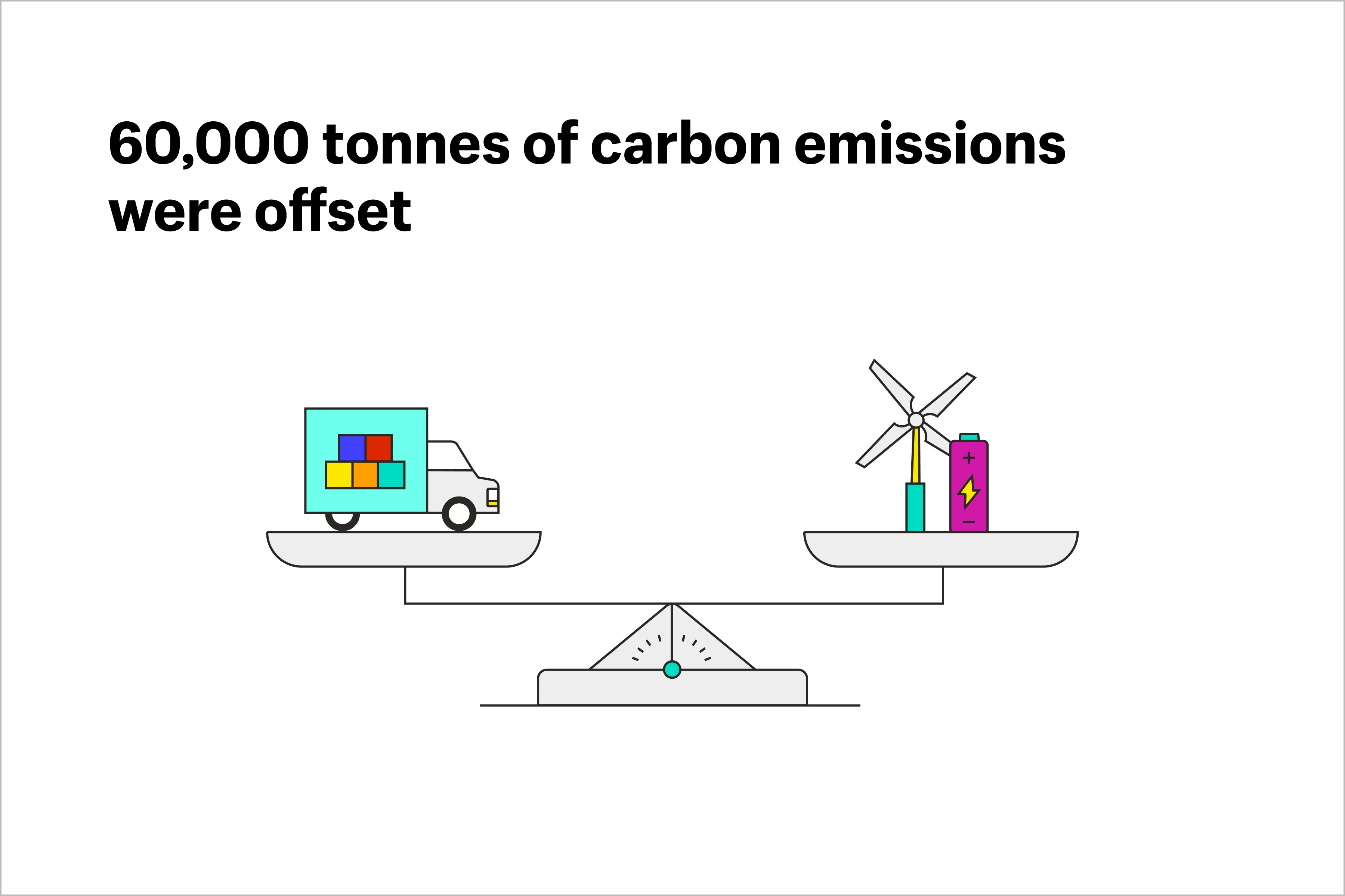这就是为什么在BFCM周末期间,Shopify抵消了我们平台上每笔订单的所有碳排放,从而抵消了近6万吨的碳排放。