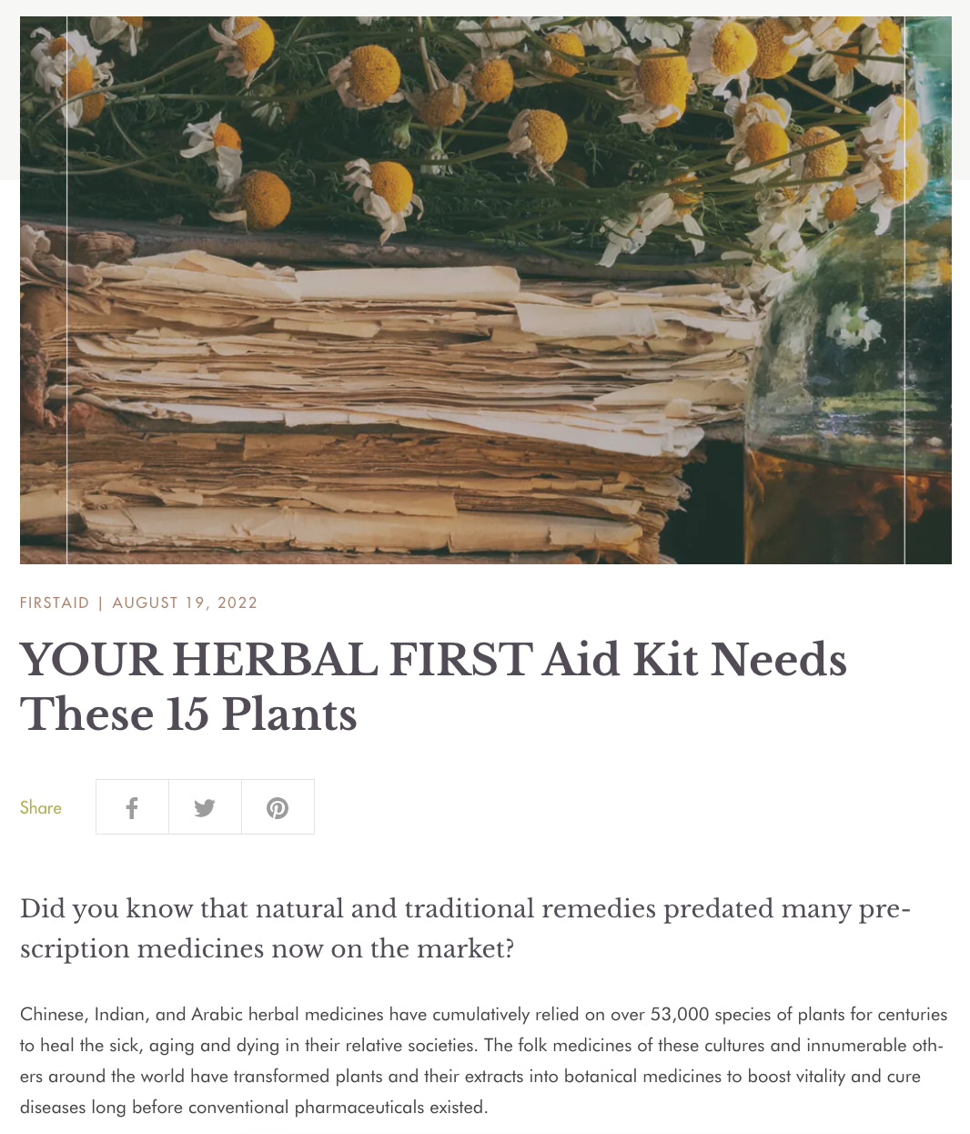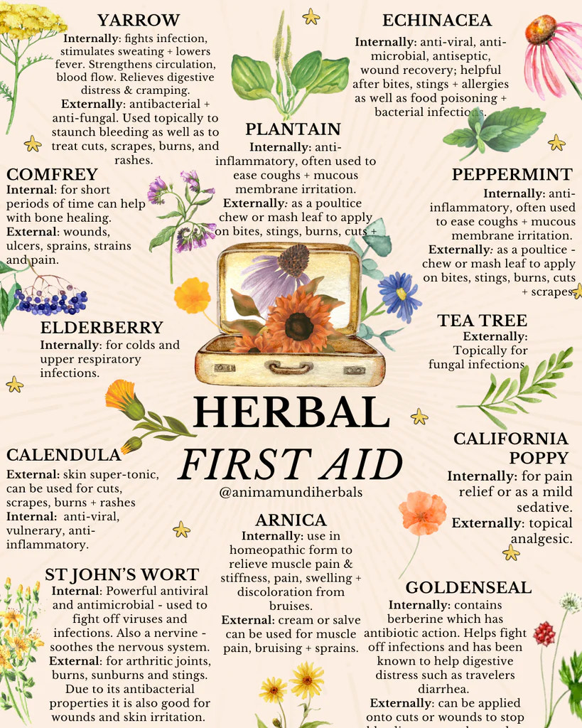 在线药剂师动物世界草药例如,它有一个博客,在那里分享食谱、技巧和有关草药的信息。这篇文章收集15种你需要的植物来制作你的家庭急救箱。