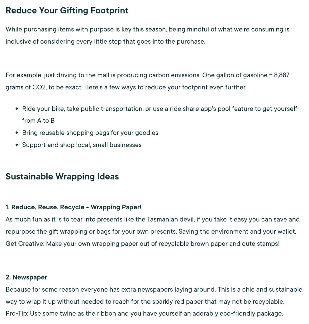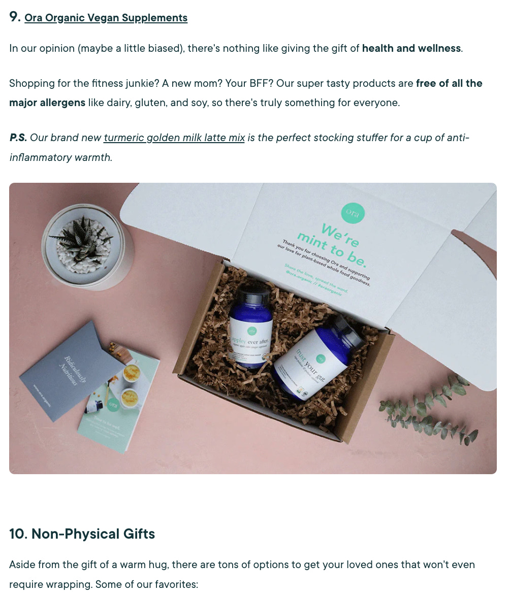 这种类型的博客文章有双重作用,因为它可以成为一个可分享的愿望清单,你的读者会传递下去,和那些不知道该给吉他手、足球迷、素食主义者或瑜伽士买什么礼物的绝望的礼物搜寻者可以通过搜索引擎找到它。