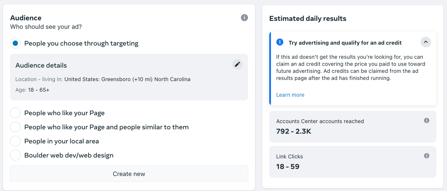 您将获得选择和优化您在受众部分创建的潜在客户或重新定位列表的选项。选择地点、性别、年龄和语言可以进一步缩小你的受众范围,并提供更多的变化来测试不同的广告设置。选择“Create new”来创建您的受众。