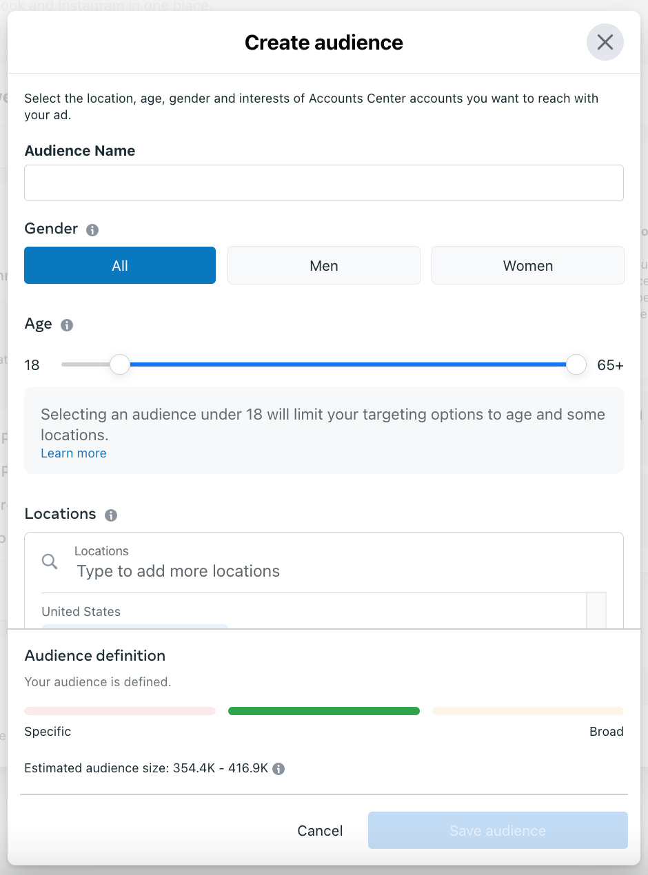 你可能想要从兴趣、行为和人口统计的所有可用选项中测试一些用户。由于兴趣、行为和人口统计受众通常相当广泛,并且由数十万甚至数百万用户组成,因此最好对它们进行单独测试,以便找到最有效的方法。