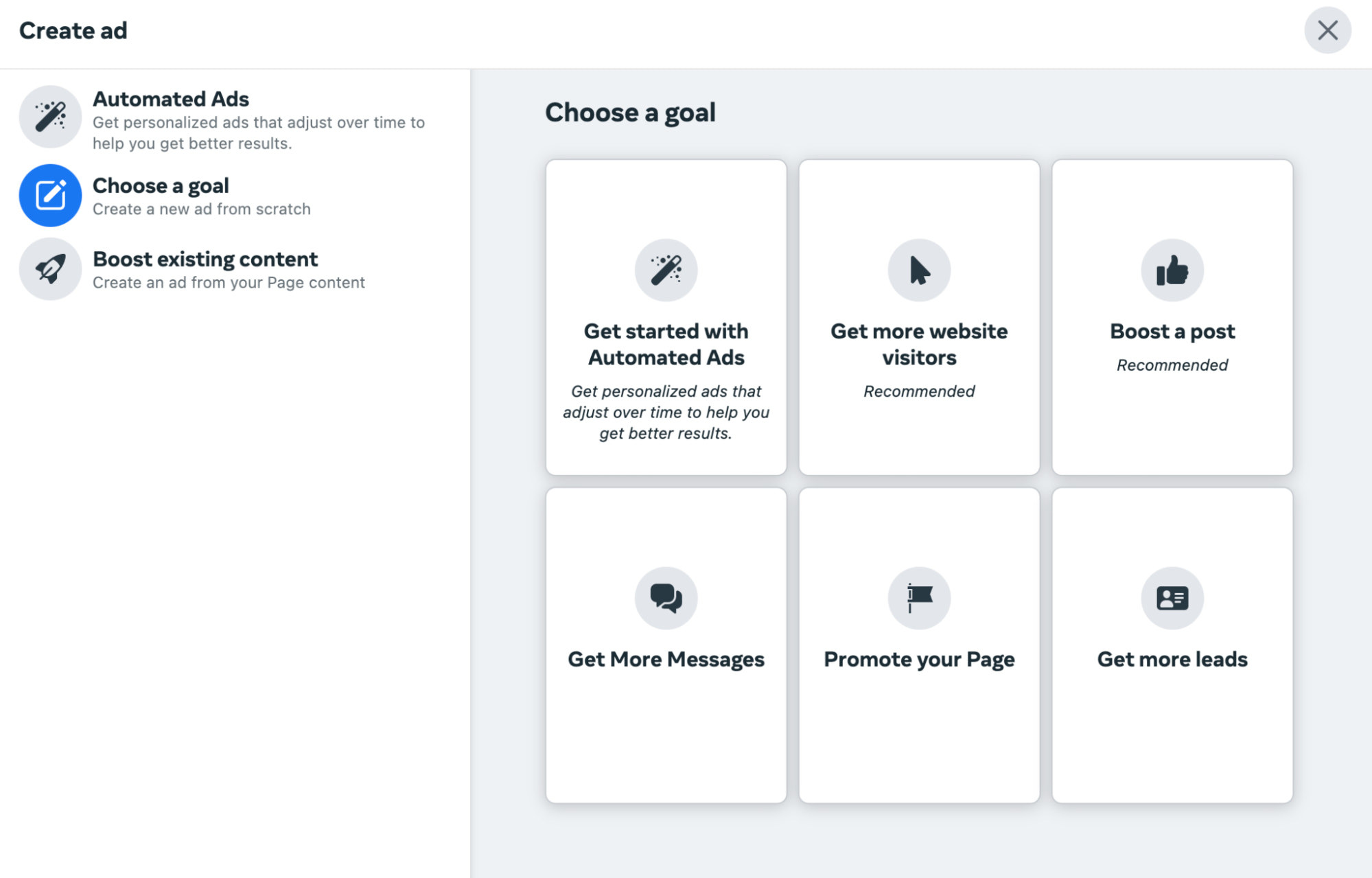 要开始创建您的第一个广告系列,请转到您的Meta Business Suite帐户中的广告部分,然后单击“创建广告”按钮。然后,你会被要求选择一个目标。