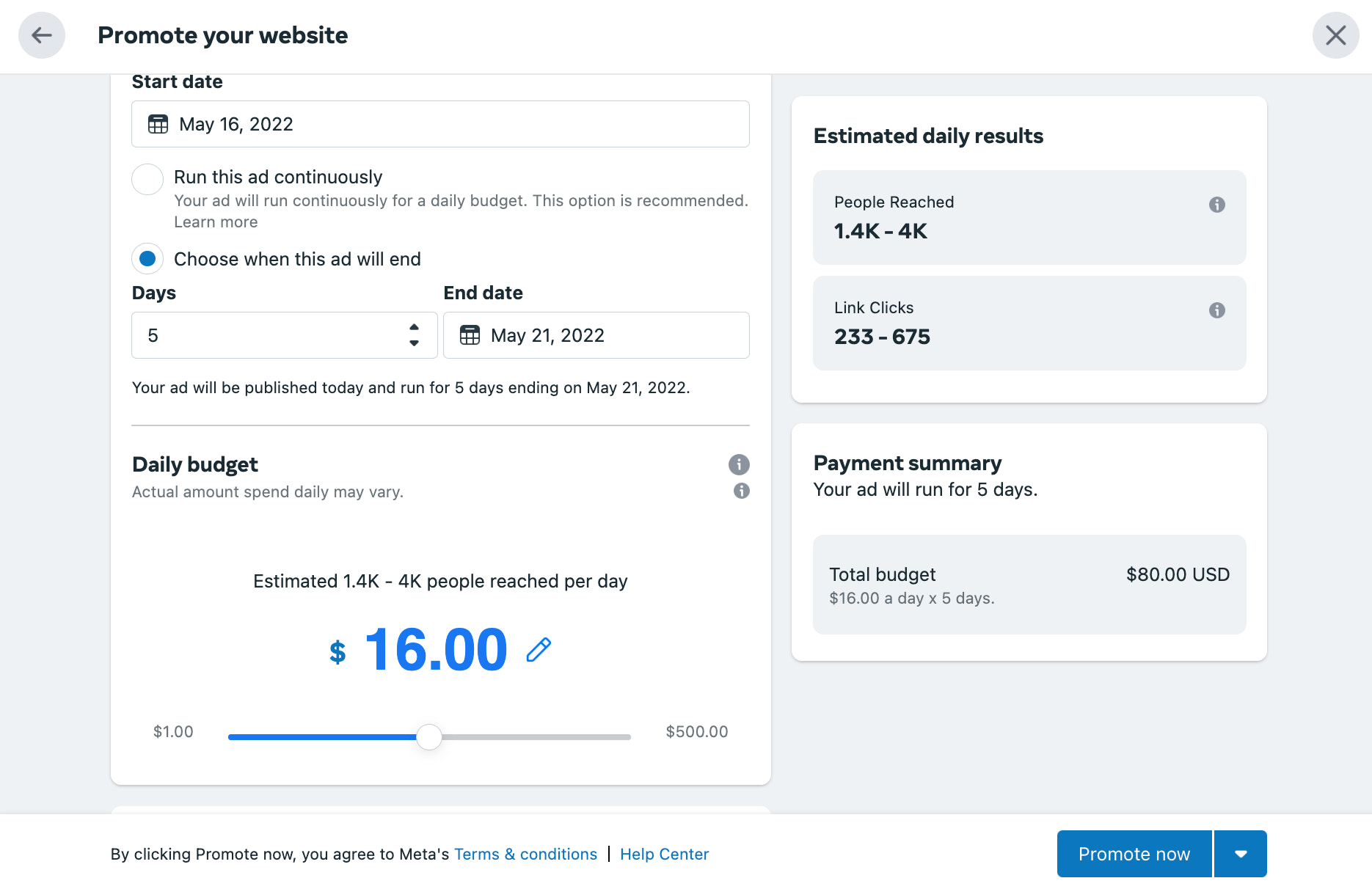 然后,输入你的预算,选择是每天预算还是一生预算。决定在Facebook广告上花多少钱这取决于几个因素: