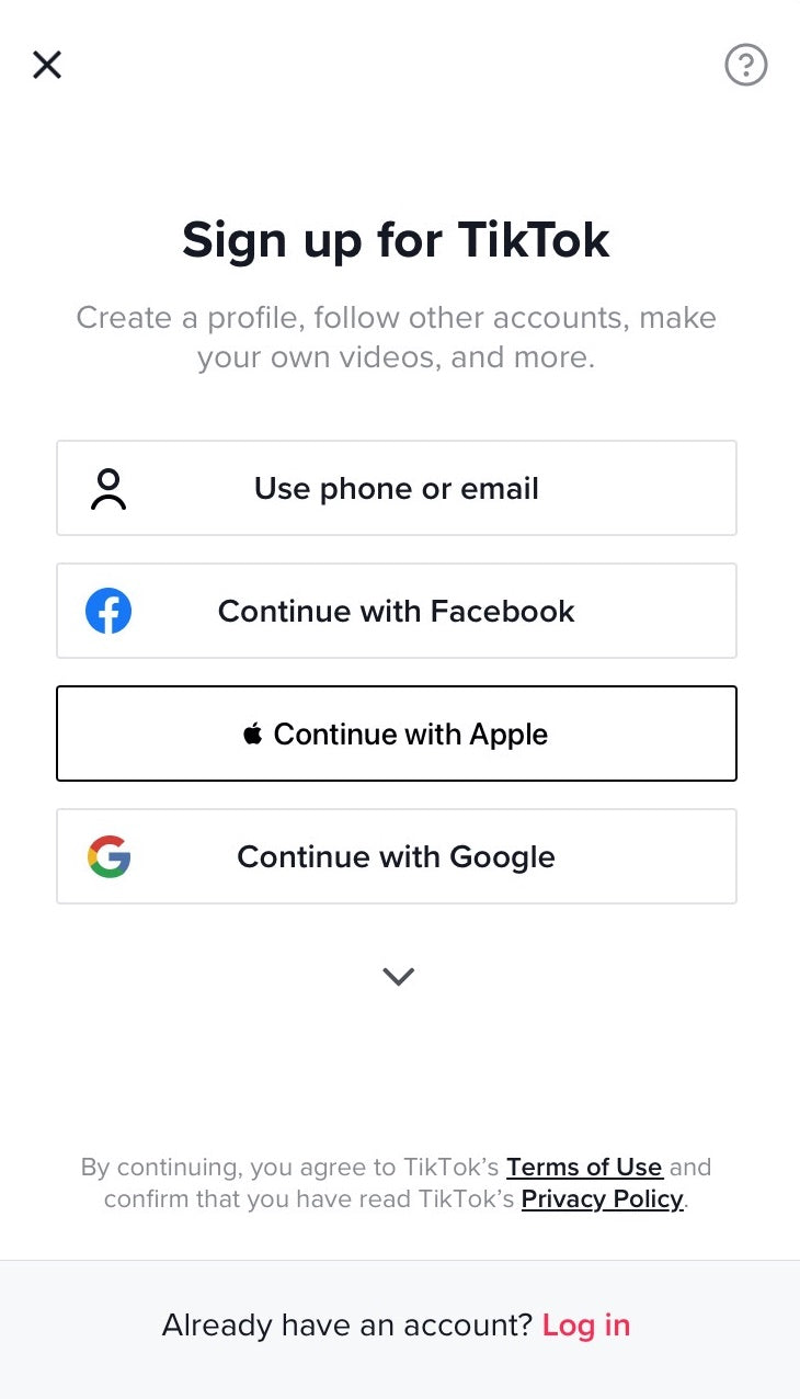 - 在那里,点击下载将TikTok安装到你的手机上。然后你会想要打开应用程序并点击报名,你可以填写你的电子邮件地址和密码(或使用你的谷歌、Twitter、Facebook或苹果账户)。
