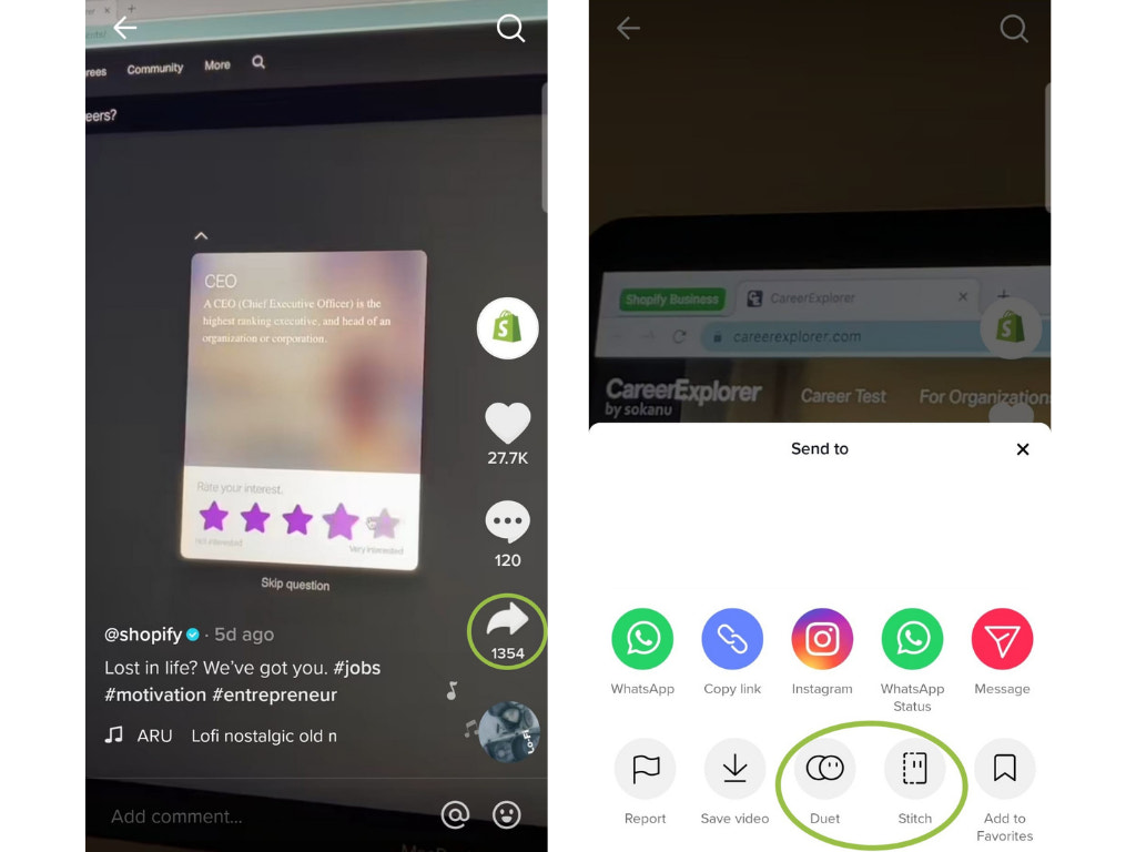 要使用这些功能,请点击分享任何视频右下角的箭头。这将为您提供许多选择,通过应用程序或外部分享视频到Instagram, Whatsapp等。沿着底部一行的图标,你会看到两个说二重奏或缝合。