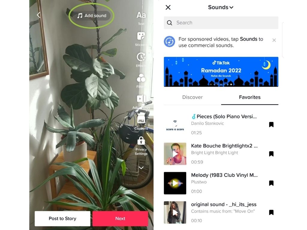 - 添加声音。如果你正在寻找一个特定的声音,通过前往创建屏幕拍摄一个新的视频来找到它。在屏幕的最上方,你会看到“添加声音”选项。这将把你带到一个你可以发现的页面热门TikTok声音访问你的最喜欢的.您还可以使用搜索函数在页面顶部。