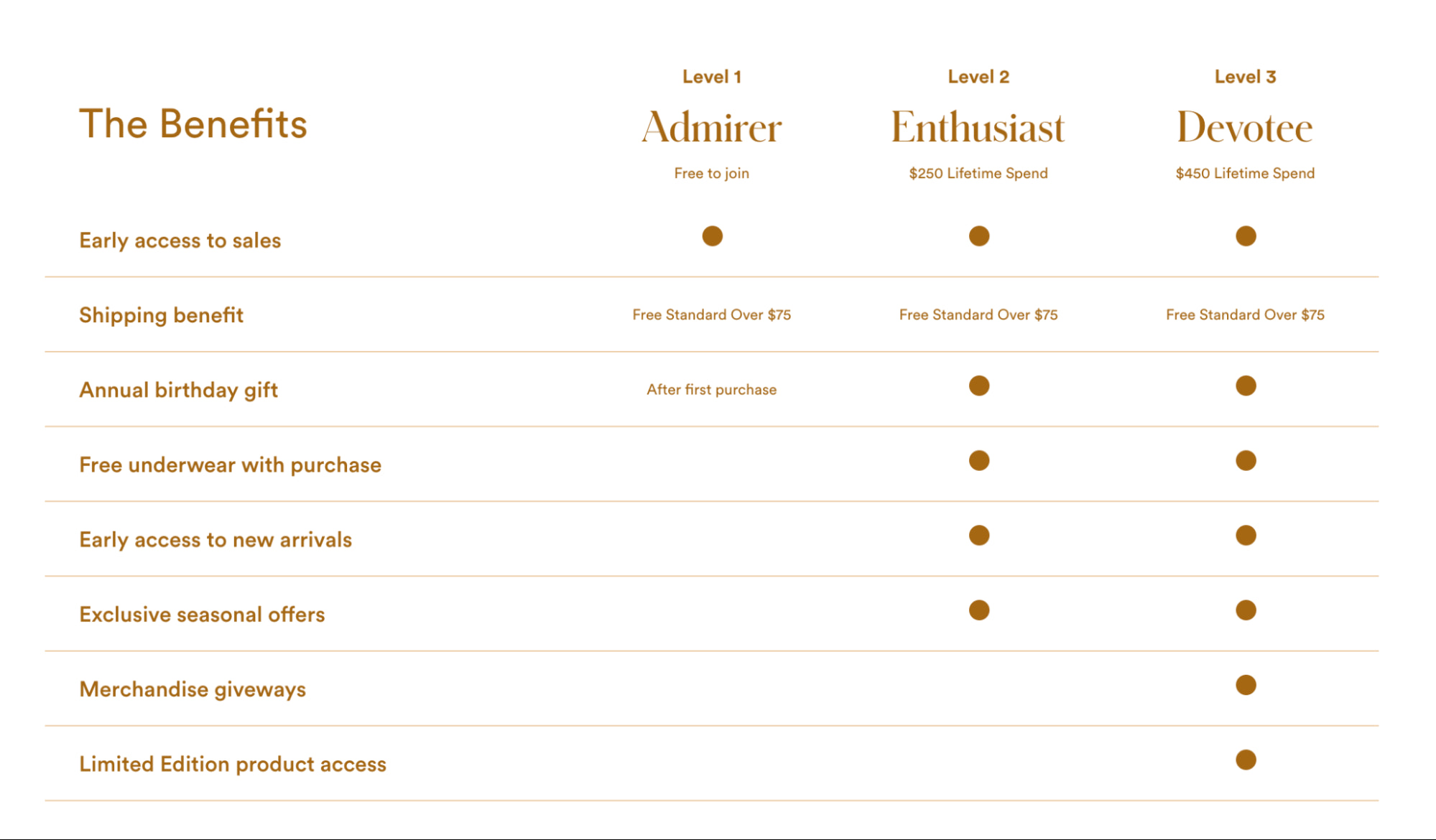 一旦消费者在该品牌上花费250美元,他们就会成为发烧友。这一层享有更多的福利,如购买免费内衣和独家季节性优惠。如果顾客在该品牌消费超过450美元,他们就可以获得赠品和限量版产品。