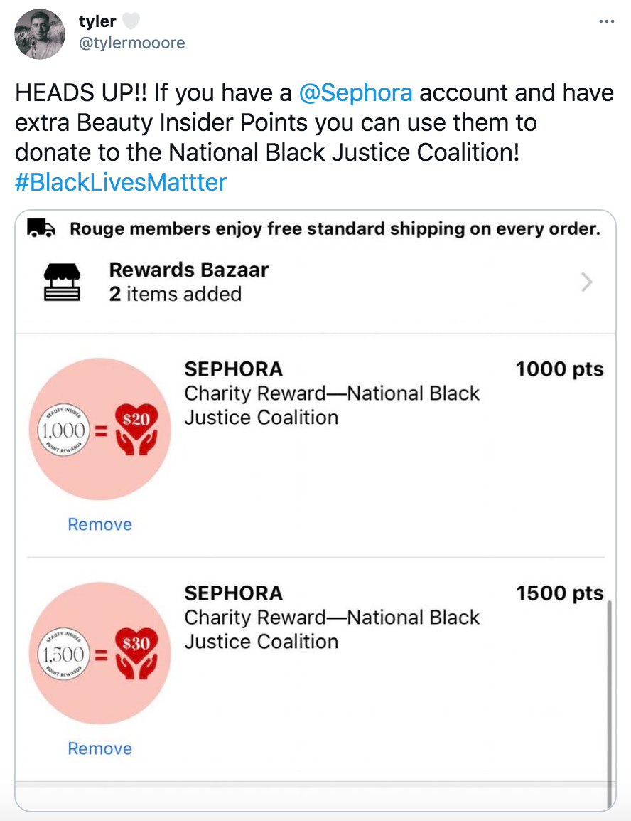 例如,丝芙兰允许会员捐赠奖励积分全国黑人正义联盟