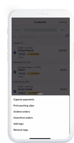 当您准备完成一组订单时,请使用Shopify移动应用程序批量选择您希望首先完成的订单组。如前所述,这可以基于订单日期、产品类型或仓库中的位置、包装要求、交付方法、订单价值或客户细分。无论您使用何种分组和优先级系统,目标都是一次完成具有相似质量的多个订单,而不是逐个处理每个订单。