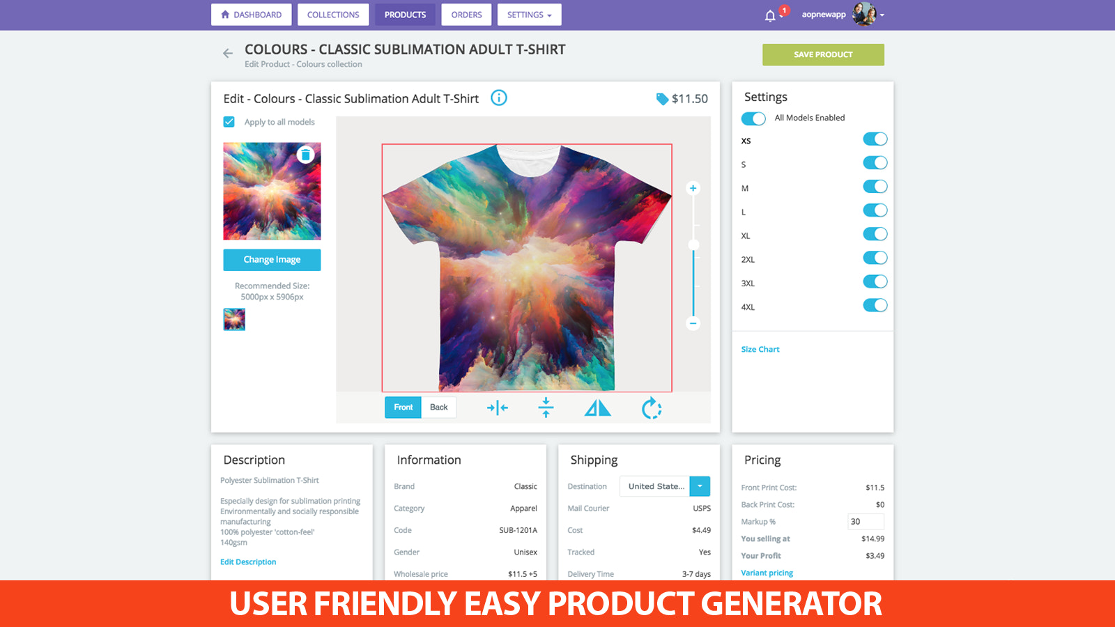 AOP+ Easy Print on Demand是Shopify和Etsy的一个应用程序,有200多种按需印刷产品。AOP+的不同之处在于它也是制造商——因此您可以直接使用它来开发定制的衬衫。这个选项对于白色标签尤其有用。