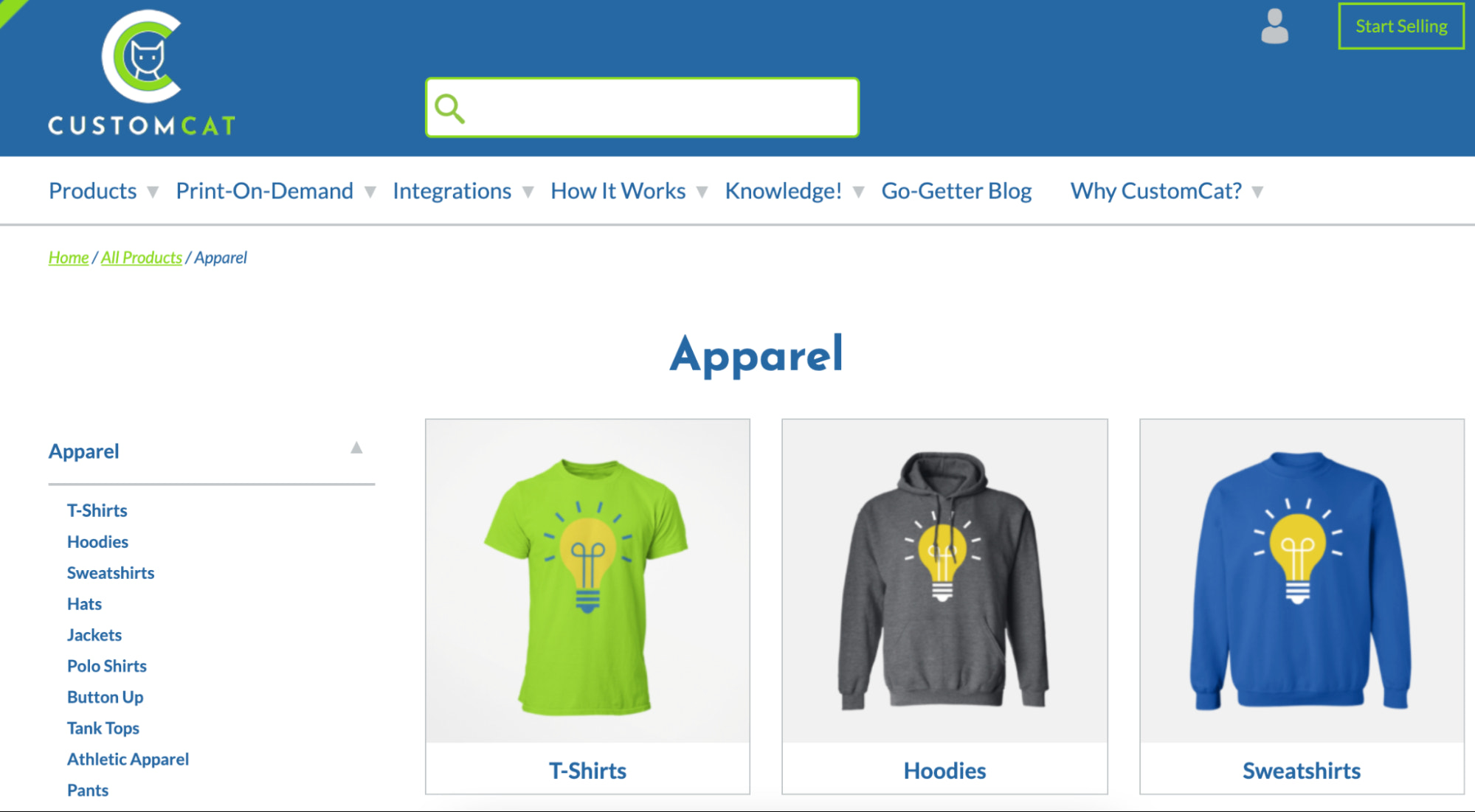 CustomCat的按需印刷服务提供了大量的服装选择——你可以从70种t恤款式中选择,还有polo衫、纽扣衫、背心、运动衫和连帽衫。衬衫的尺寸和颜色因款式而异。有些款式有20多种颜色可供选择,尺码为XS-3XL。