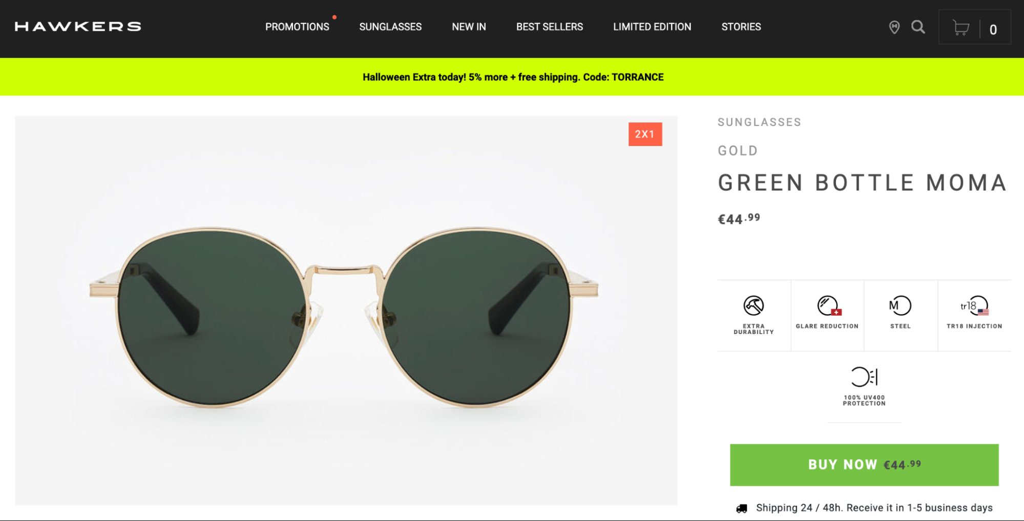 如果答案是否定的,没有什么可说的,那么您可能会想要使用传统的产品页面。很多容易理解或非常直观的产品都是如此,比如衣服或太阳镜,比如小贩下面的例子。