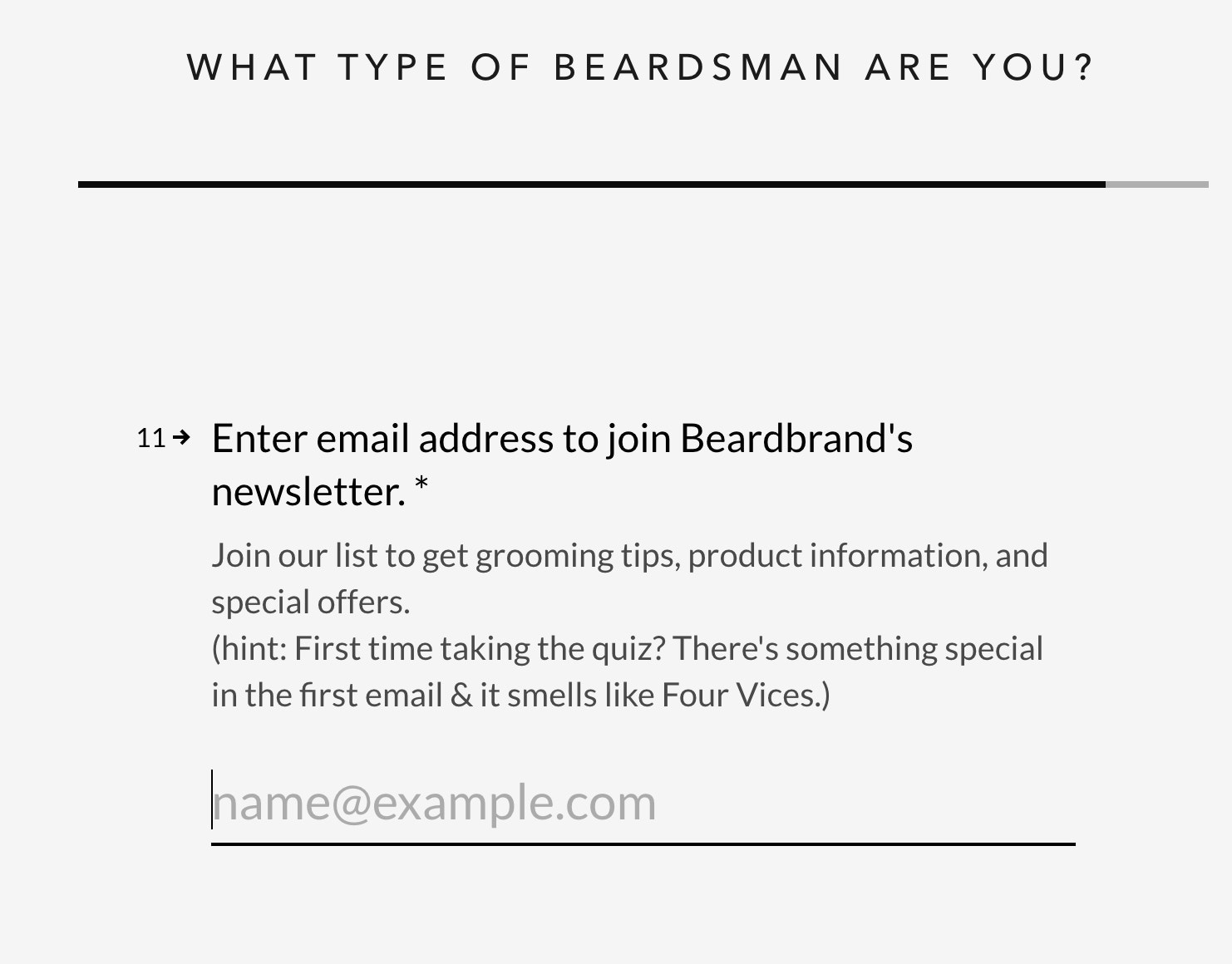 Beardbrand例如,通过互动测验激发人们的兴趣。游客可以通过这种类型来了解他们是什么类型的胡子网站个性化.